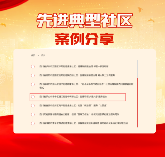 近年来,乐山市市中区认真落实党中央和省委、市委关于加强党建引领基层治理工作的部署要求,着力在完善体系、健全机制、统筹协调、赋权扩能、系统推进上持续发力,推动形成牛咡桥社区、桂花楼社区等一批共建共治融合好、居民群众反响好、示范带动效应好的示范社区。近日,牛咡桥社区党建引领社区治理做法成功入选中组部“先进典型社区案例”,在共产党员网首页“先进典型社区案例分享”专栏刊载推广,成为全市唯一入选案例。现将原文刊载如下。
