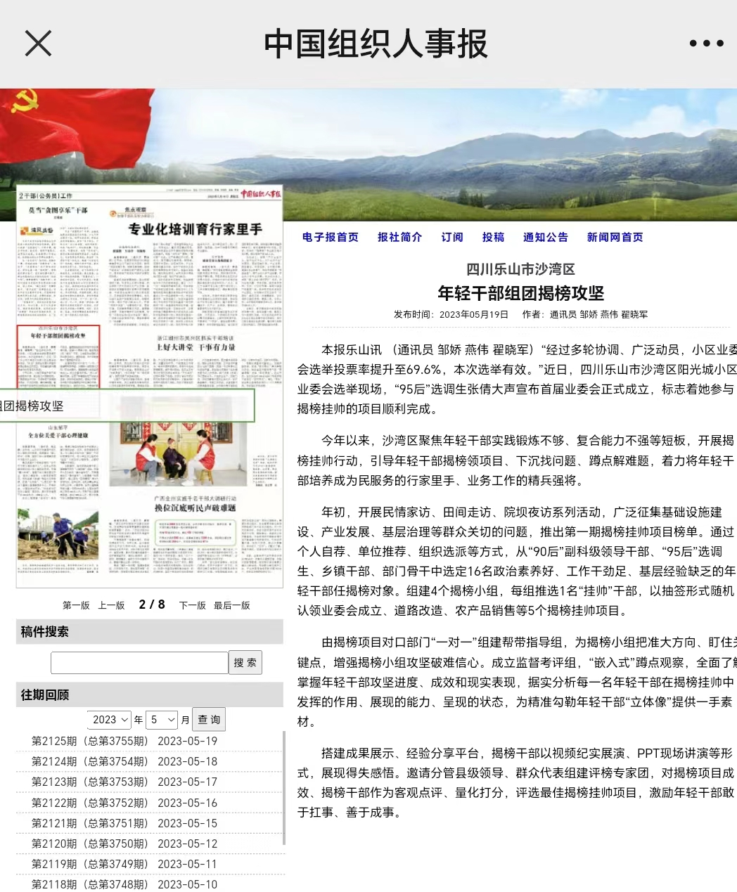 今年以来,沙湾区聚焦年轻干部实践锻炼不够、复合能力不强等短板,创新开展年轻干部“揭榜挂帅”行动,引导年轻干部揭榜领项目、下沉找问题、蹲点解难题,着力加强年轻干部斗争精神和斗争本领养成,让想干事的干部有机会,能干事的干部有舞台,营造你追我赶、比学赶超的良好氛围。5月19日,沙湾区年轻干部组团揭榜攻坚相关做法被《中国组织人事报》关注报道,现将原文刊载如下。