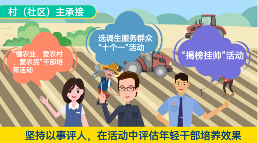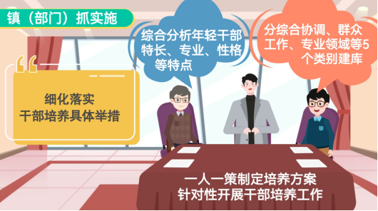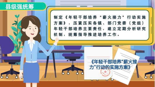 县级强统筹,制定《年轻干部培养“薪火接力”行动实施方案》,统筹指导推进各镇、部门党委(党组)年轻干部培养工作。镇(部门)抓实施,细化落实干部培养具体举措,综合分析年轻干部特长、专业、性格等特点,针对性开展干部培养工作。村(社区)主承接,以“懂农业、爱农村、爱农民”干部培育活动、“揭榜挂帅”等活动为抓手,将基层一线作为年轻干部培养主战场。
