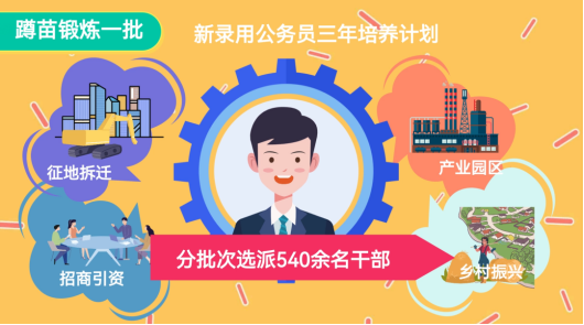 蹲苗锻炼一批,实施“一线工作法”,分批次选派540余名干部到产业园区、招商引资、乡村振兴等一线实践锻炼。轮岗历练一批,采取渐进式培养方式,对新进干部3年内在机关重点股室全覆盖轮岗一遍,对基本成熟干部放在中层岗位进行重点锻炼。结对帮带一批,推行协同帮带模式,将年轻干部放在本单位承担的重点项目建设、牵头的先进示范创建等任务中“手把手”帮带。