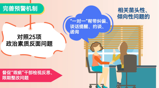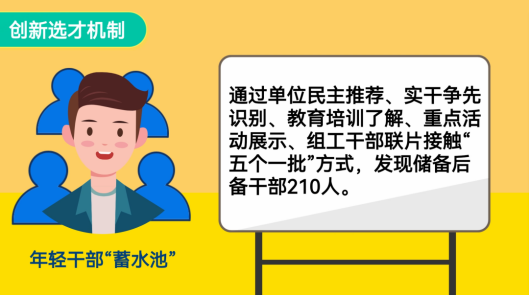 创新选才机制,分类建立年轻干部“蓄水池”,通过单位民主推荐、实干争先识别等“五个一批”方式,发现储备优秀年轻干部210人。丰富激励机制,对实绩突出的干部,在晋升职级、评先评优等方面优先考虑,激励干部担当作为。完善预警机制,建立“红黄”双色预警机制,对相关问题,依次采取“一对一”帮带纠偏、谈话提醒、约谈等方式,督促“瑕疵”干部反思、整改问题。