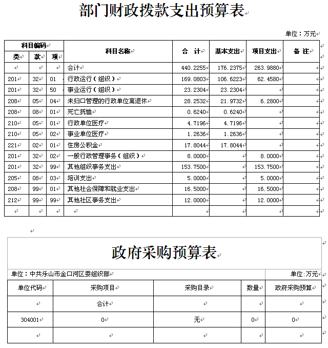 按照预算管理有关规定,目前部门预算的编制实行综合预算制度,即全部收入和支出都反映在预算中。 一、基本职能及主要工作 中共乐山市金口河区委组织部是中共乐山市金口河区委主管组织工作和干部工作的职能部门。主要职责是研究、指导全区各级党组织特别是党的基层组织的建设;研究、探索我区各类新经济组织中党组织的设置和活动方式;协调、规划和指导我区党员教育工作,主管我区党员管理和发展党员工作。提出各乡镇和区级各部门及区委、区政府管理的企事业单位以及其他列入区委管理的领导班子的调整、配备和领导干部任免的意见和建议;负责区、乡镇机关干部综合协调、监督检查干部宏观管理工作和备案审查工作;指导科级领导班子的思想作风建设,组织落实培养和选拔中青年干部,加强后备干部队伍建设;研究、指导全区党的组织制度和干部人事制度改革,制定或参与制定我区组织、干部、人事工作的重要政策和制度;参与制定全区军队转业干部的安置,内调干部的审查、大中专毕业生的分配等有关政策、规定,配合有关部门做好全区干部的录(聘)用工作的宏观管理;主管干部教育工作,制定全区干部教育规划和有关政策规定;负责省、市、区委党员及其他有关培训班学员的调剂;负责组织区科级中青年干部和党务工作者进行培训;指导、协调干部教育基地建设、师资队伍建设;负责全区知识分子管理教育的牵头抓总工作。调查了解知识分子工作情况,制定或参与制定知识分子政策,检查全区贯彻执行知识分子政策的情况;会同有关部门选拔、管理区级拔尖人才;联系和组织一定层次的知识分子和专业人才开展活动;归口管理区委老干部局,负责离退休干部工作的宏观管理,研究制定或参与制定我区离退休干部工作的有关规定和政策;归口管理区委党建领导小组办公室,负责全区党建日常工作;负责全区党史研究及编写工作;完成区委和市委组织部交办的其他工作任务。 二、部门概况 中共乐山市金口河区委组织部属于党政机关单位,其中有归口管理行政单位5个,参公事业单位1个、事业单位1个。 三、收支预算总体情况 2016年区委组织部收入预算总额为440.2255万元,其中:当年财政拨款收入440.2255万元,事业收入0万元,上年结转收入0万元。相应安排支出预算440.2255万元,其中:一般公共服务354.0607万元,社会保障和就业45.3772万元,医疗卫生5.9832万元,住房保障支出17.8044万元,城乡社区支出12万元。 四、支出预算安排情况 组织部部门(单位)预算安排支出主要用于保障该部门机构正常运转、完成日常工作任务以及承担全区干部和党建事业发展相关工作。 基本支出,是用于保障组织部机关、归口管理单位等机构正常运转的日常支出,包括基本工资、津贴补贴等人员经费以及办公费、印刷费、水电费、办公设备购置等日常公用经费。 项目支出,是用于保障组织部机关、归口管理单位等机构为完成特定的行政工作任务或事业发展目标,用于专项业务工作的经费支出。 按支出功能分类主要用于以下方面: (一)一般公共服务,主要用于机关及下属事业单位人员工资、日常运转以及为完成特定行政工作任务和事业发展目标而安排的年度项目支出。主要包括:党建工作、远程教育、村级组织建设、教育培训等。 (二)社会保障和就业,主要用于机关及归口管理单位离退休人员支出。 (三)医疗卫生,主要用于机关及归口管理单位按照规定标准为职工缴纳的基本医疗保险及公务员医疗补助等支出。 (四)住房保障支出,用于机关及归口管理单位按照规定标准为职工缴纳住房公积金等支出。 (五)城乡社区事务,主要用于全区远程教育站点的运行费用等支出。 (六)教育支出,主要用于全区党员教育培训支出。