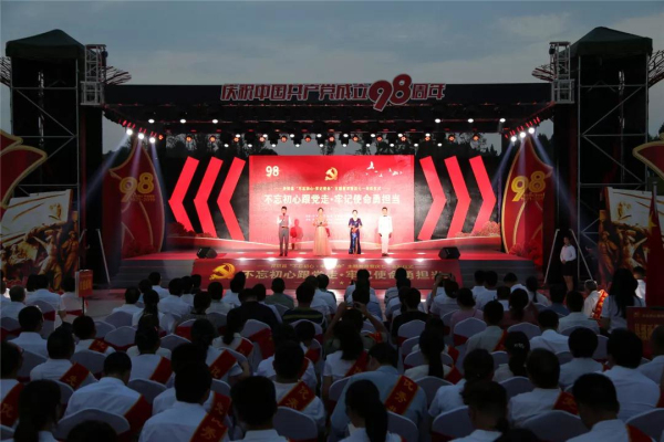 活动上,县委书记周华荣代表中共井研县委、县人大常委会、县人民政府、县政协,向出席本次活动的各位领导、各位来宾表示诚挚的欢迎!向全县各基层党组织和广大党员致以节日的问候!向受表彰的先进集体和优秀个人表示热烈的祝贺! 周华荣指出,今天是中国共产党成立98周年生日。98年来,中国共产党历经风雨、力挽狂澜,带领中华民族从站起来、富起来到强起来,创造了一个又一个“中国奇迹”,贡献了一个又一个“中国智慧”。我们要以习近平新时代中国特色社会主义思想为指导,牢记为中国人民谋幸福、为中华民族谋复兴的初心和使命,继承和发扬革命先烈光荣传统,以实干作答,一步一个脚印、一年一个台阶,努力把井研建设成产业的高地、文化的名地、民生的福地,用实干书写井研最美好的时代篇章! 庆祝活动分为序幕、第一篇章“不忘初心 梦想起航”、第二篇章“不忘初心 砥砺前行”、第三篇章“不忘初心 方得始终”、第四篇章“不忘初心 牢记使命”、尾声等六个部分。《我和我的祖国》《红色印记》《把一切献给党》《烈日下的1949》《爱我中华》《永远跟党走》《茉莉花开》《我爱你中国》《不忘初心》《党旗更鲜艳》……一首首饱含深情的歌曲、一支支绚丽夺目的舞蹈,抒发了井研儿女对党的无限热爱之情,为在场的广大观众带来了一场丰富的视听盛宴。整场晚会高潮迭起,精彩纷呈,赢得台下掌声阵阵。随着压轴节目大合唱《没有共产党就没有新中国》出场,鲜艳的党旗、五星红旗全场舞动,活动现场变成了红色的海洋。