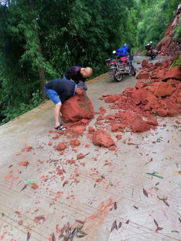 图为茨梨村党支部书记熊明富,副书记陈明凯,徒手搬开滚落的山石