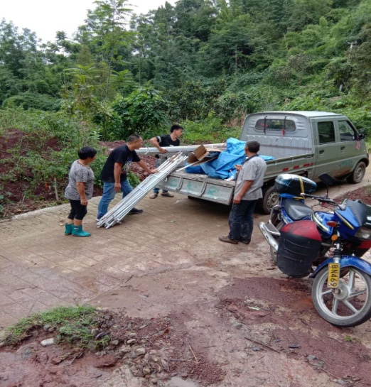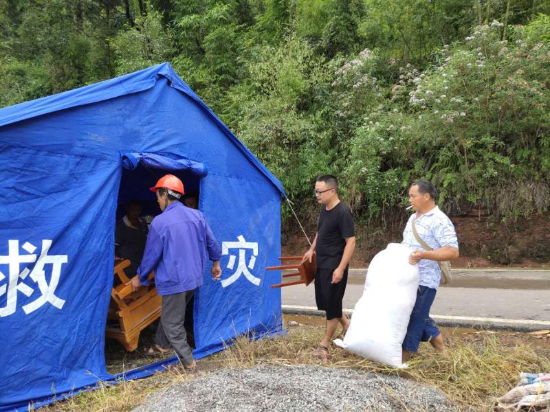 图为泥河村党支部书记周成兵组织村组干部为安置点2户7人搬运帐篷等临时避难物资