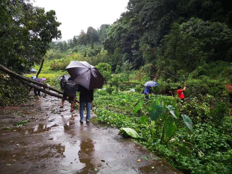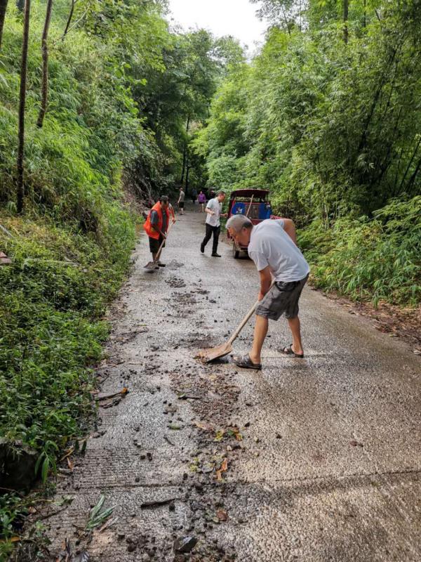 图为仁厚村党员干部、村民代表、保洁员冒雨清理倒塌书目,保障汛期公路安全畅通 |
