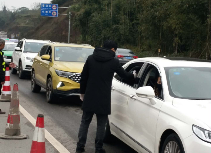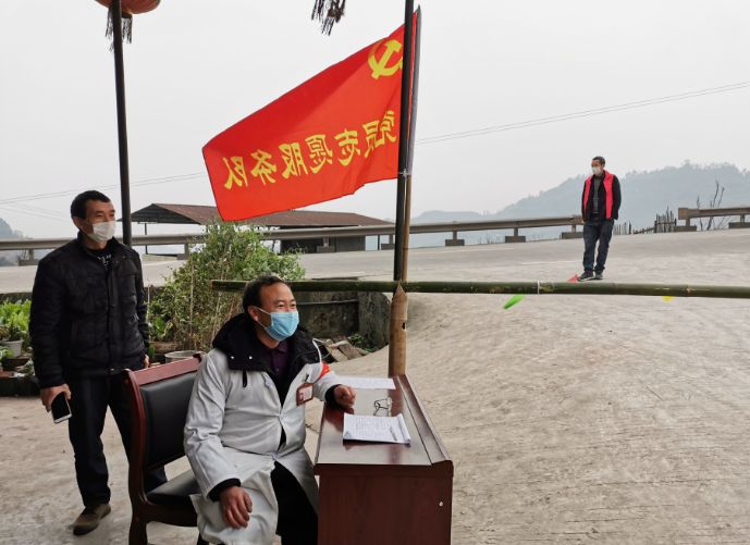 沐川-犍为交界处检查关卡工作的富新镇干部 在这场没有硝烟的战斗中,富新镇成立党员志愿服务队21支,设置疫情防控卡点61个,200余名党员干部冲锋在前。胸前锃亮的党徽是闪耀的名片,高高飘扬的党旗是亮丽的风景线。 光荣碑卡点党员服务队
