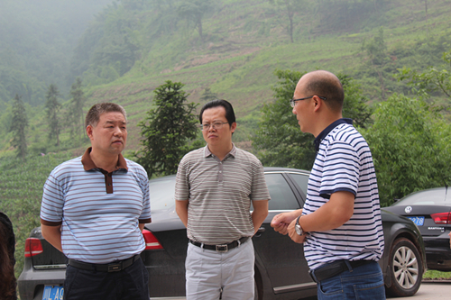 省委组织部党员教育中心调研员陈东(左一)在县委常委、组织部长宗国洪(左二)的陪同下调研建和乡庙坪村雷竹种植基地现场