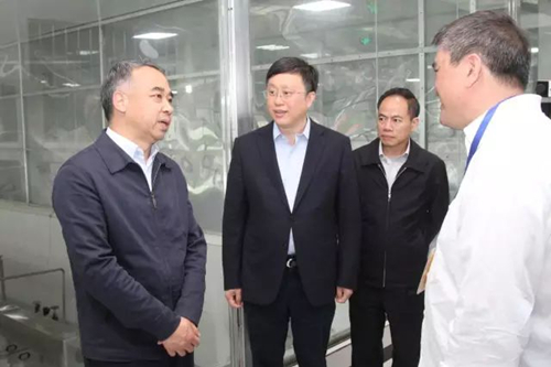 省委常委、组织部长范锐平(左一)在市委书记彭琳(左二)和市委常委、组织部长熊伟(左三)的陪同下调研森态源生物科技公司现场