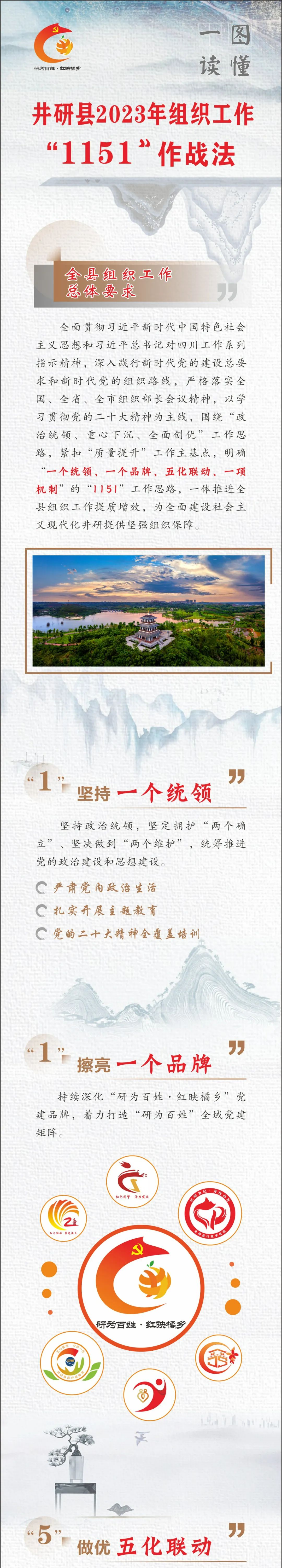 编者按:2023年,井研县坚持以学习贯彻党的二十大精神为主线,聚焦全国、全省、全市组织部长会议安排部署,围绕全市组织工作“质量提升年”工作主基点,研思确定井研县2023年“1151”组织工作思路,确保在开局中把准前进方向,推动组织工作质效全面提升。
