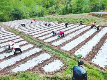 光荣村村民正在蔬菜基地移栽菜苗。受访者供图