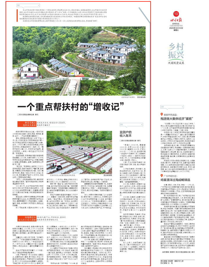 其中,蔬菜是光荣村的“头号”产业。5月4日,村党支部书记李易坤和驻村第一书记祝伟正在蔬菜大棚里组织黄瓜采摘。当天,1万多斤黄瓜将被运到峨眉山市的批发市场,根据品相定价4角到1元。“隔两天就可以摘一次,月底开始种番茄。通过种蔬菜,一亩地一年收益近万元没问题。”李易坤说。