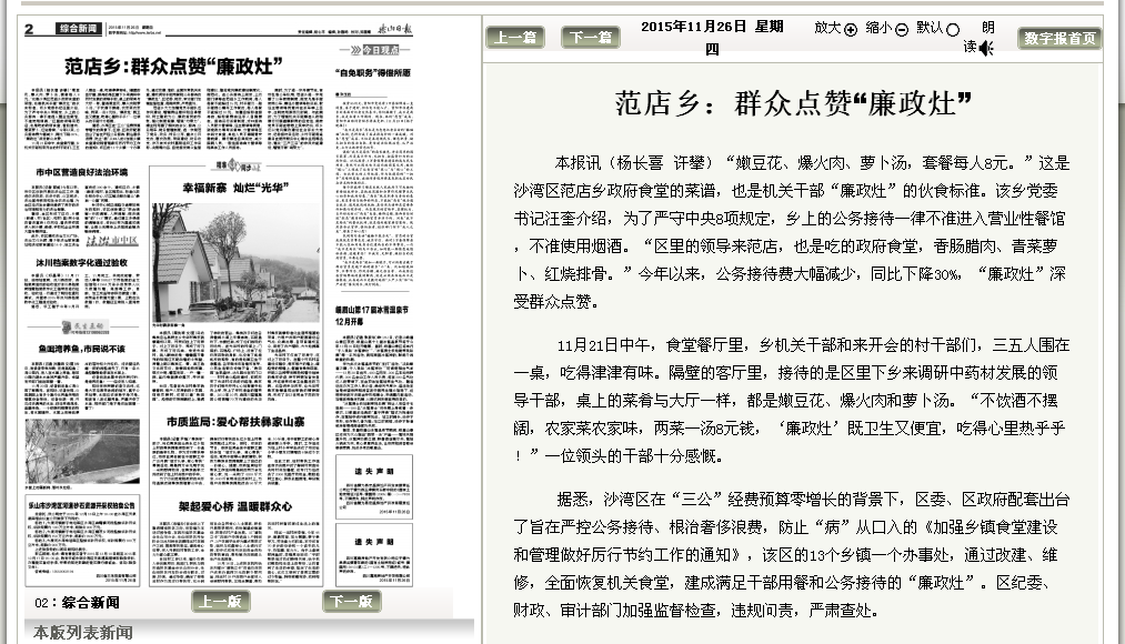 本报讯(杨长喜 许攀)“嫩豆花、爆火肉、萝卜汤,套餐每人8元。”这是沙湾区范店乡政府食堂的菜谱,也是机关干部“廉政灶”的伙食标准。该乡党委书记汪奎介绍,为了严守中央8项规定,乡上的公务接待一律不准进入营业性餐馆,不准使用烟酒。“区里的领导来范店,也是吃的政府食堂,香肠腊肉、青菜萝卜、红烧排骨。”今年以来,公务接待费大幅减少,同比下降30%,“廉政灶”深受群众点赞。 11月21日中午,食堂餐厅里,乡机关干部和来开会的村干部们,三五人围在一桌,吃得津津有味。隔壁的客厅里,接待的是区里下乡来调研中药材发展的领导干部,桌上的菜肴与大厅一样,都是嫩豆花、爆火肉和萝卜汤。“不饮酒不摆阔,农家菜农家味,两菜一汤8元钱,‘廉政灶’既卫生又便宜,吃得心里热乎乎!”一位领头的干部十分感慨。