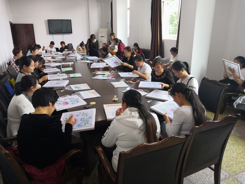 “大家要特别注意用色的细节差异,在花瓣上一定要形成色彩渐变的视觉观感”,在冠英镇政府二楼会议里,刺绣老师正在耐心细致的向学员们讲授刺绣技巧,同学们时不时的提出一些疑问或是同旁交流一下,更多的时候都在埋头飞舞着手指。