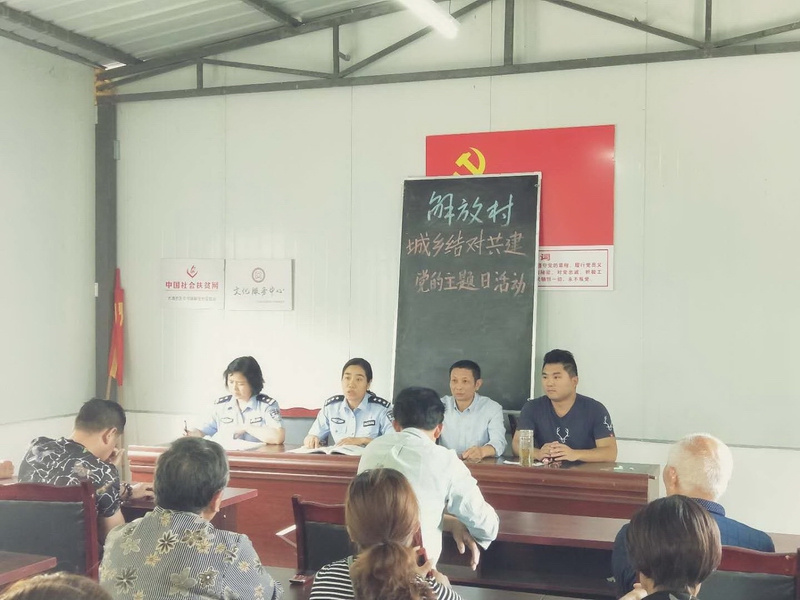 5月15日上午,区公安分局国内安全保卫部党支部书记楚丽梅带领支部党员和入党重点培养对象到牛华镇解放村,与城乡结对共建党支部一起开展以“学习讲话精神、明确使命担当”为主题的党日活动暨专题党课。会议由解放村书记覃树清主持。
