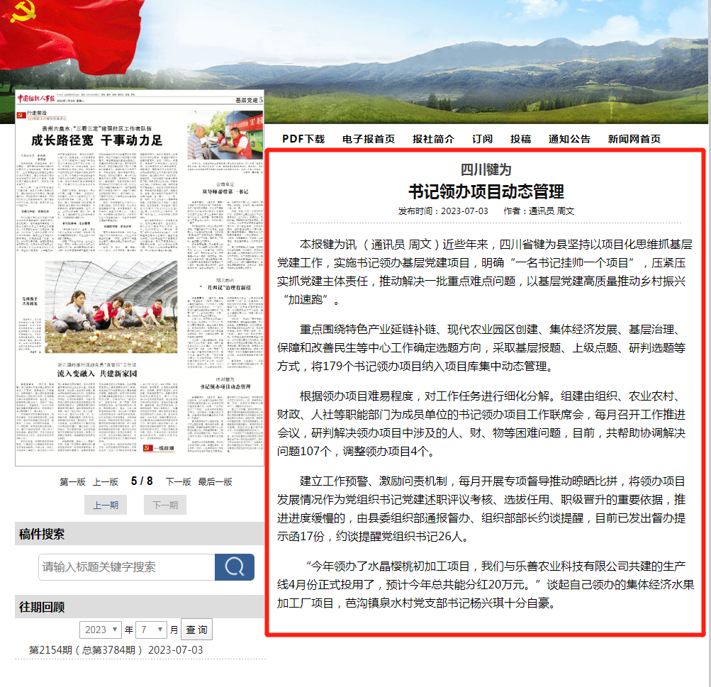 近年来,犍为县深入贯彻落实新时代党的建设总要求和新时代党的组织路线,进一步释放“党建领航·犍心为民”品牌效应,创新实施“书记领办”项目,树立“书记抓、抓书记”鲜明导向,明确“一名书记挂帅一个项目”,推动集中解决一批重点难点问题,以“书记领办”推动乡村全面振兴。7月3日,犍为县“书记领办”项目相关做法被《中国组织人事报》关注报道,现将原文刊载如下。